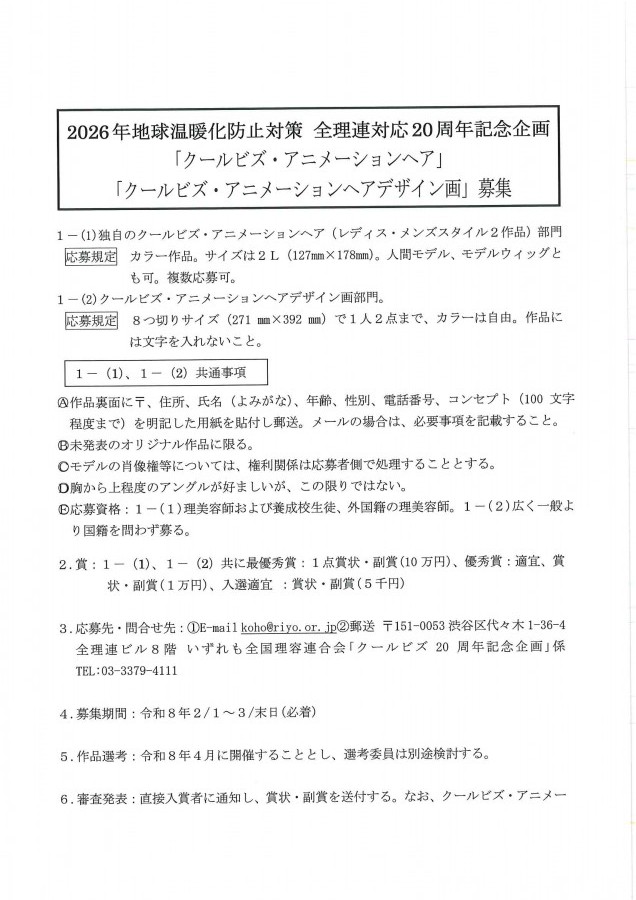 全国理容連合会では、本事業に2007年から取り組み始め、今回で20周年となりますので、記念企画として、独自の「クールビズ・アニメーションヘア(レディス・メンズスタイル2作品)部門」と併せて、「クールビズ・アニメーションヘアデザイン画部門」も国内外より募ります。
