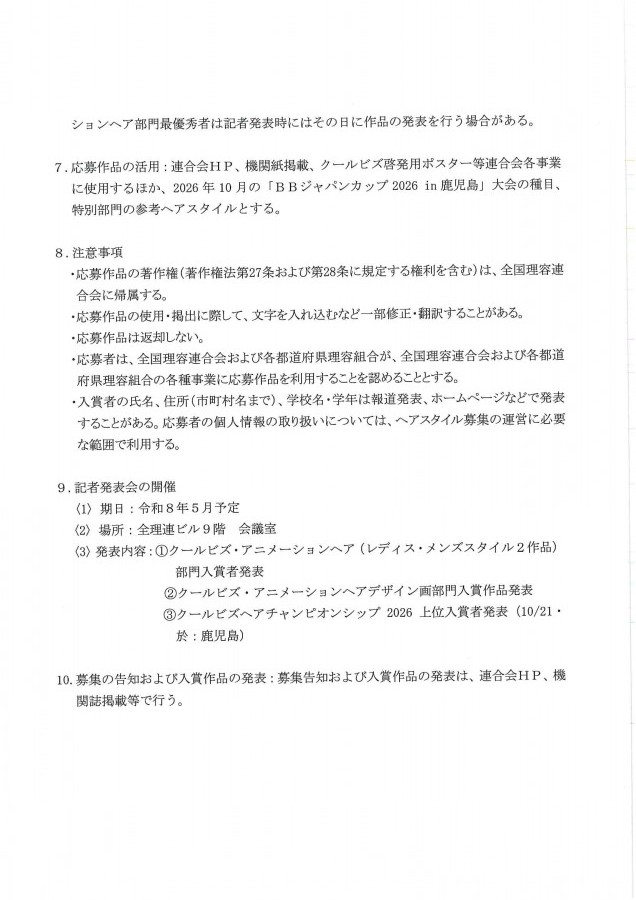 また、その入賞した作品を参考に、本年10月19日に鹿児島県で開催されるBBジャパンカップ2026の特別部門として「クールビズヘアチャンピオンシップ2026」を実施することといたしました。