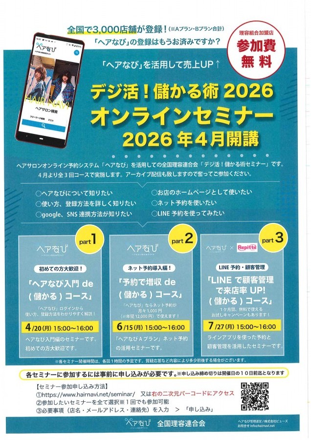 さて、当連合会ではヘアサロンオンライン予約システム「ヘアなび」を推進していますが、この度ヘアなびAプランLINE有償オプションを設け、普及拡大に向けて「デジ活!儲かる術セミナー」をオンラインで4月より3回コースで開催することといたします。